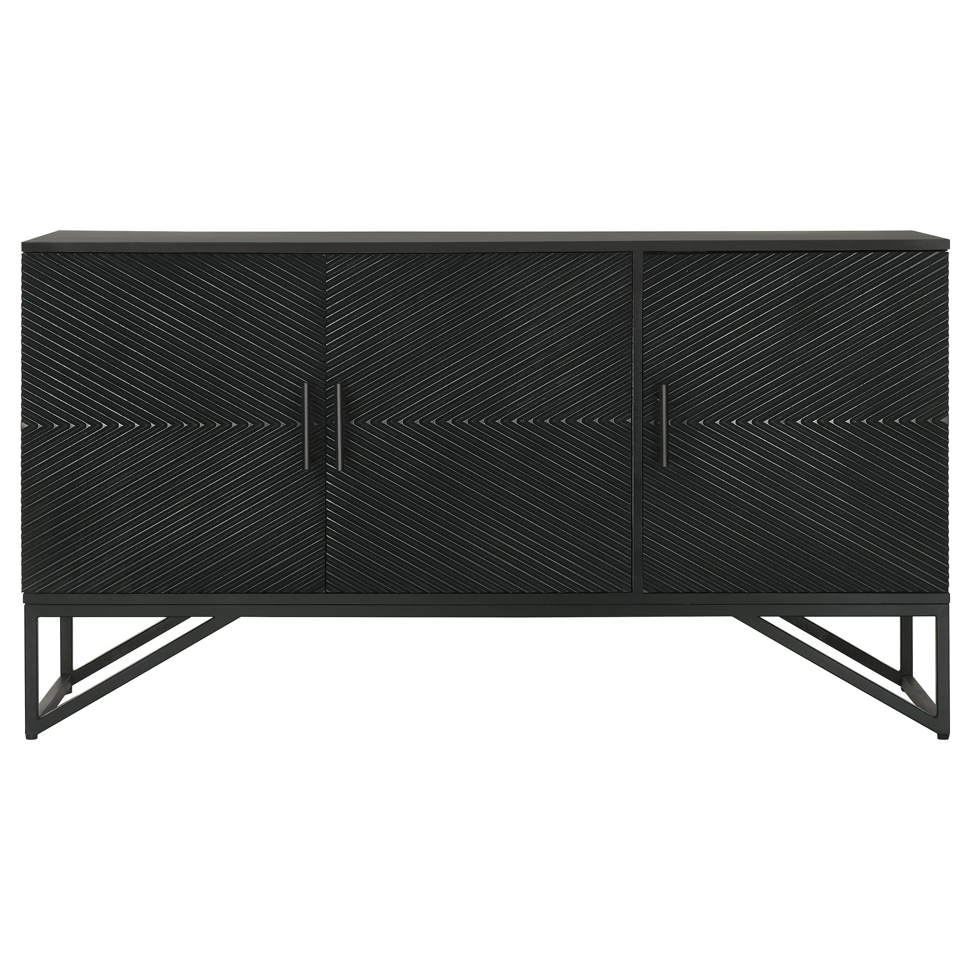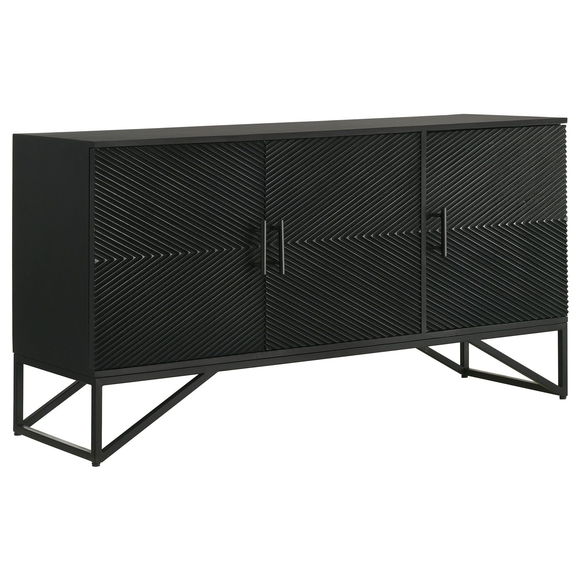 Bold finish composite wood and iron merge to create a stylish and durable four-door accent cabinet. Perfect for use in your dining room, living room, or media room, this chic cabinet is versatile and attractive. Diagonal self-striping adds textured effects on its door fronts to create a compelling look. Find space on two adjustable shelves behind four doors that open with matching black iron vertical pulls. Set atop a geometric black finish iron frame, this cabinet serves as a striking example of bold style.