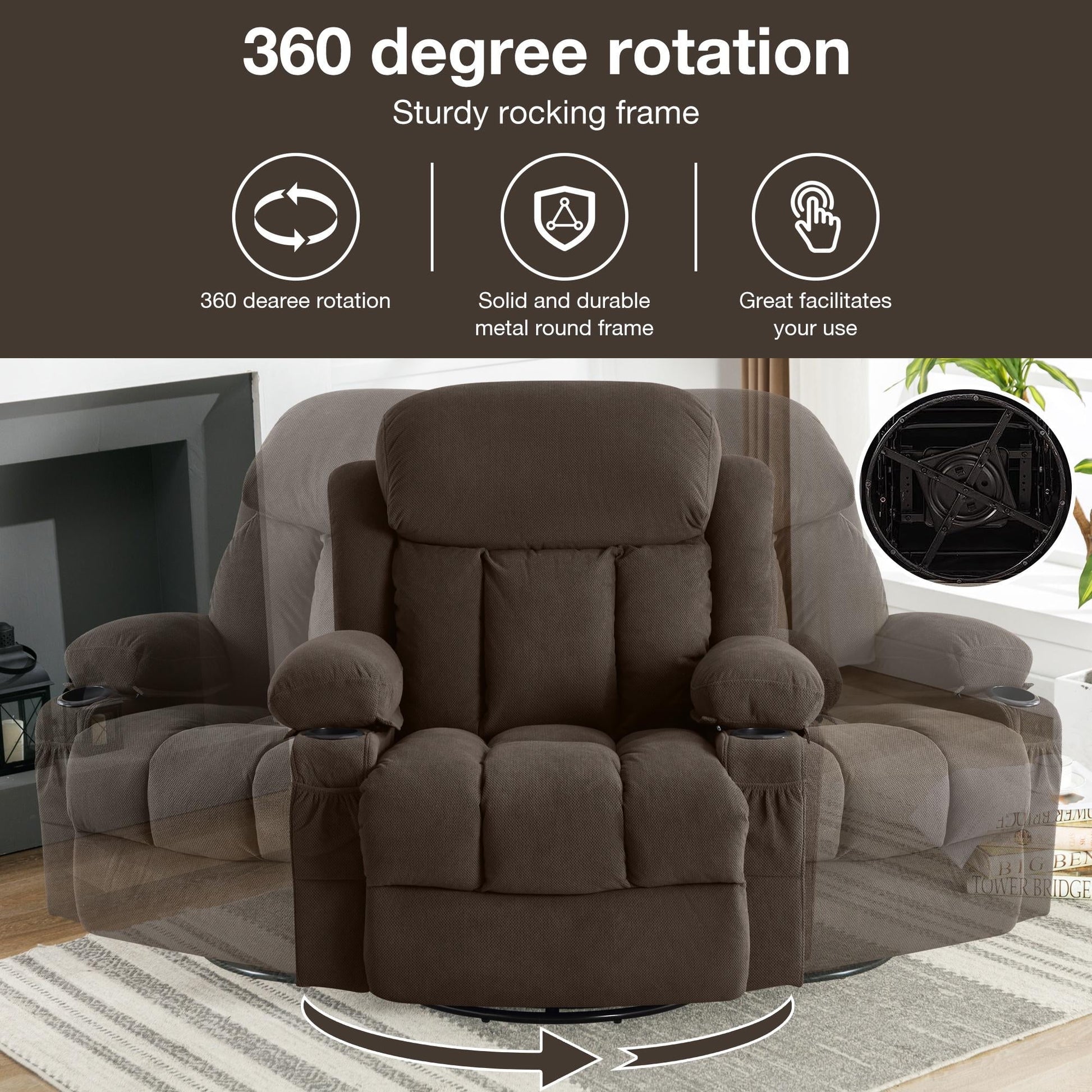 HSUNNS Oversized Rocker Recliner Chair with Swivel & Massage Function, Heat, USB Port and 2 Cup Holders, Brown