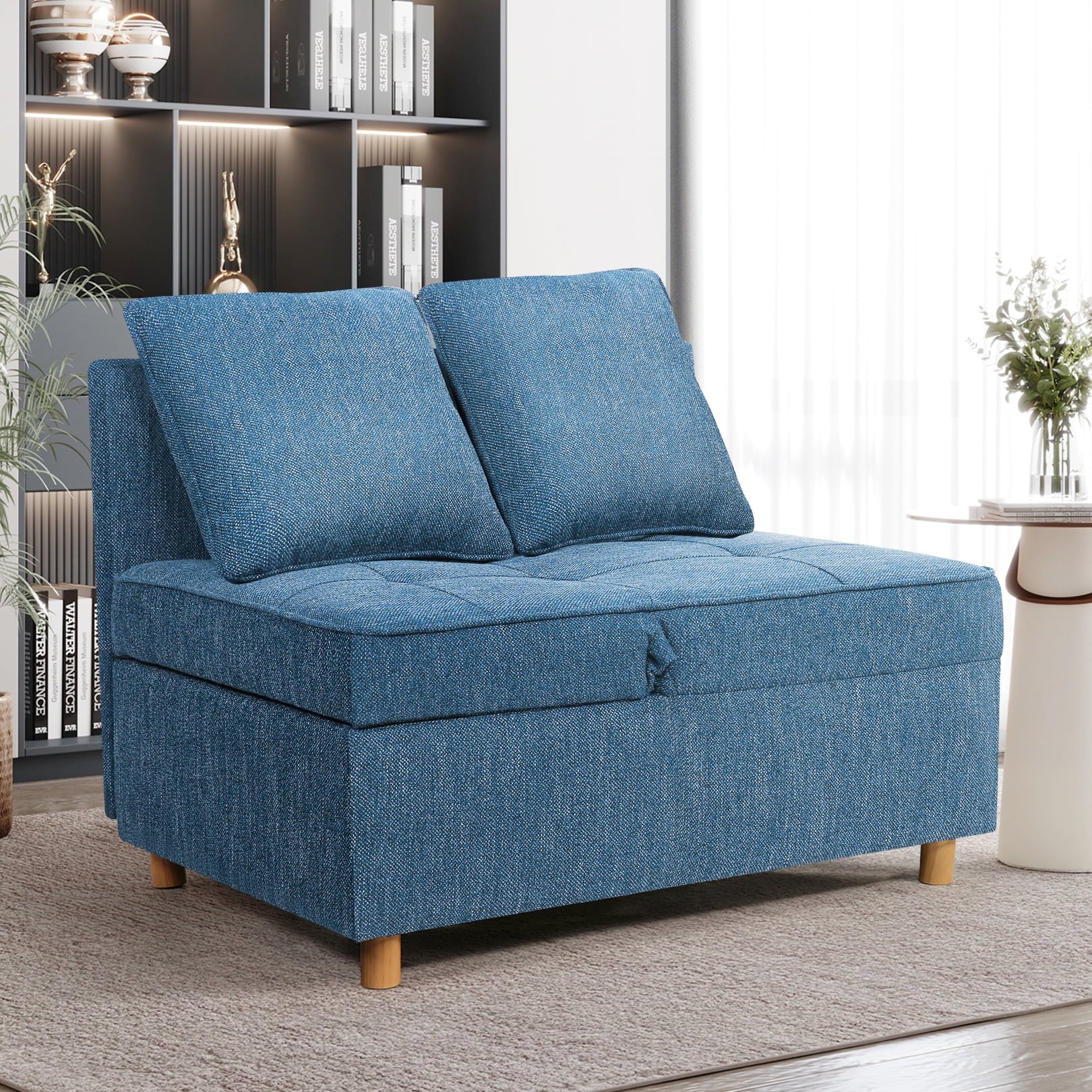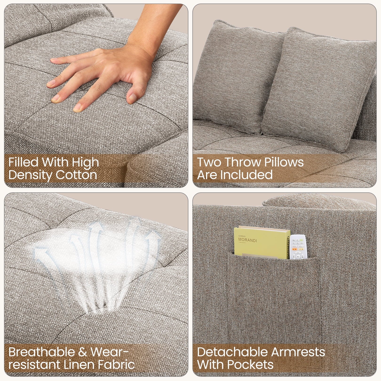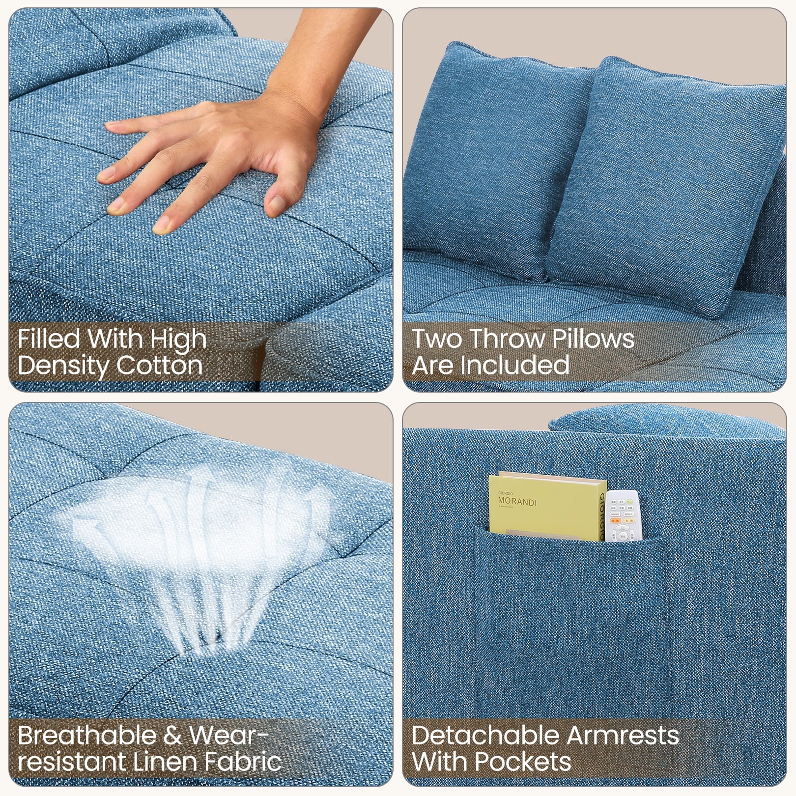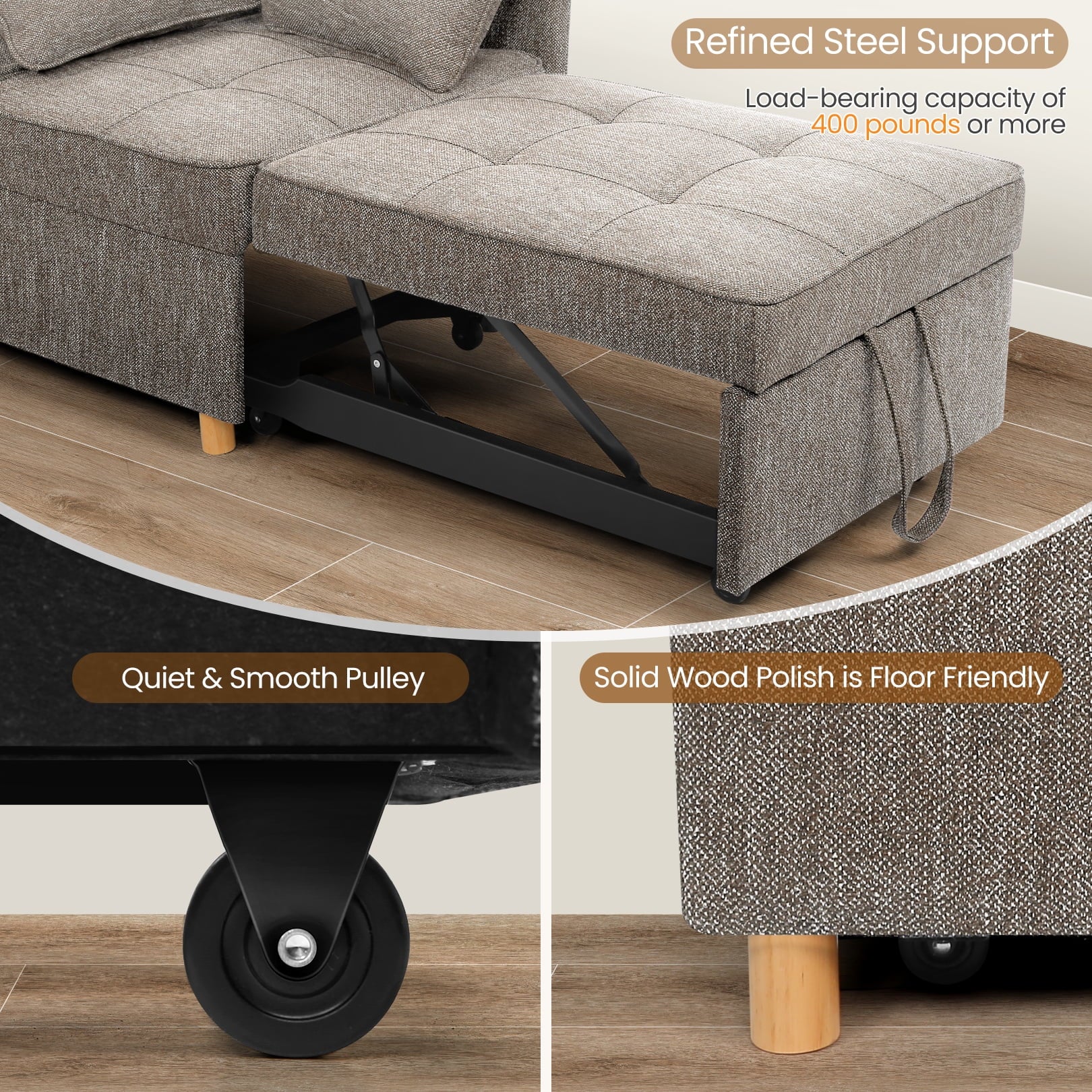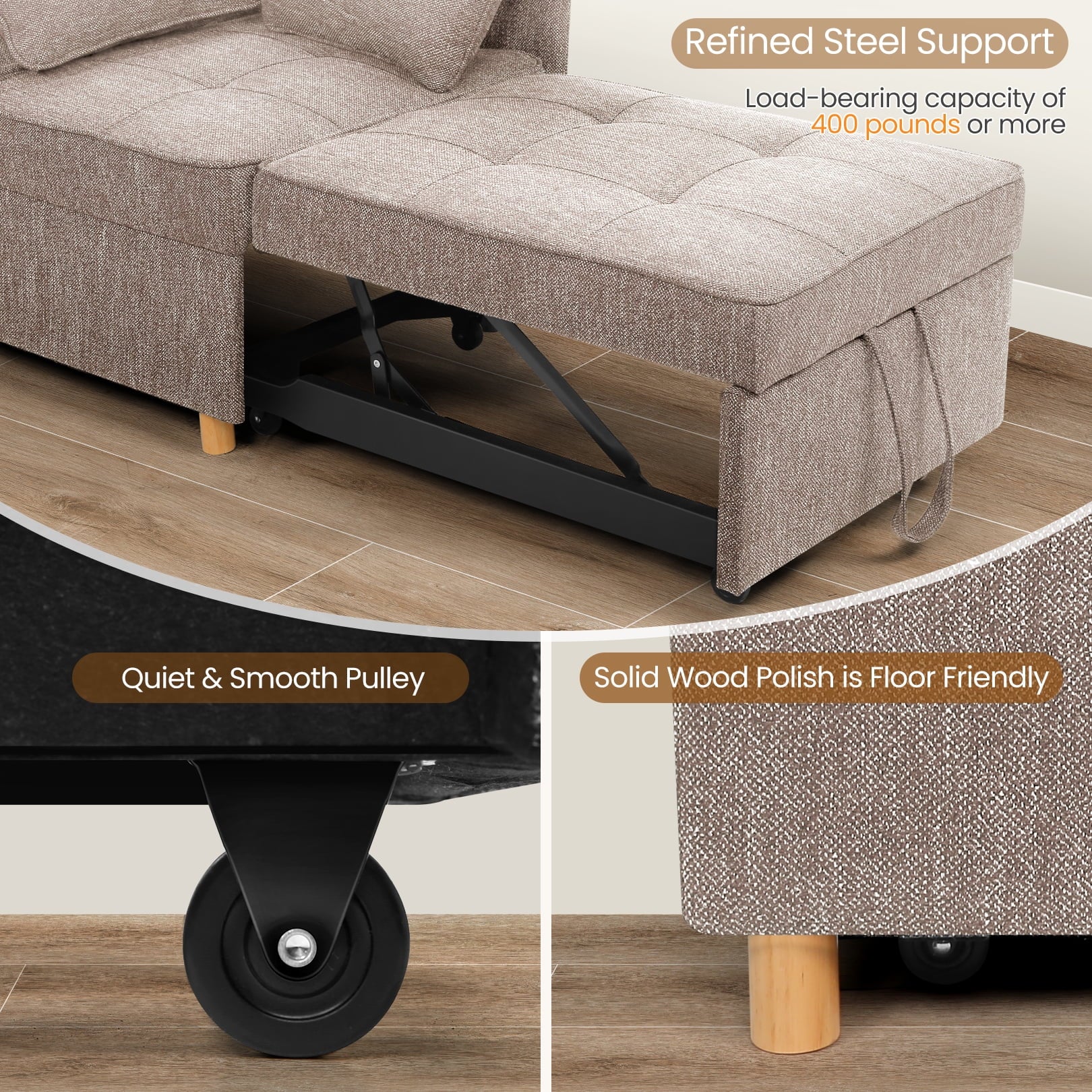 The 4-in-1 Convertible Sofa Bed is a versatile piece of living room furniture that easily and seamlessly converts into a small sofa, a loveseat, a guest bed, or even an ottoman with no assembly required. This durable fabric sofa chair bed is wrapped in breathable linen fabric and filled with premium foam for an extremely comfortable experience. The combination of solid wood and steel frame can hold up to 400 pounds, and the 26-inch wide sofa sleeper bed is wide enough for an adult to enjoy a moment of relaxation.