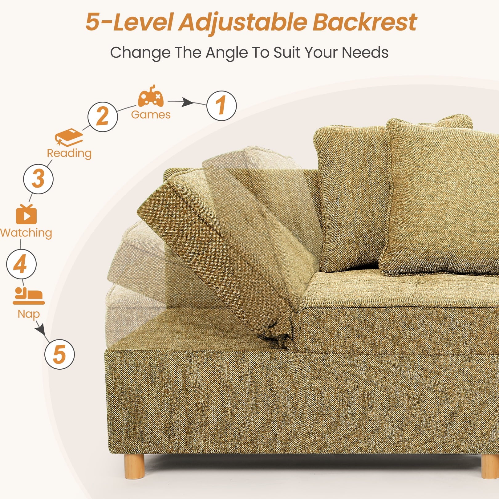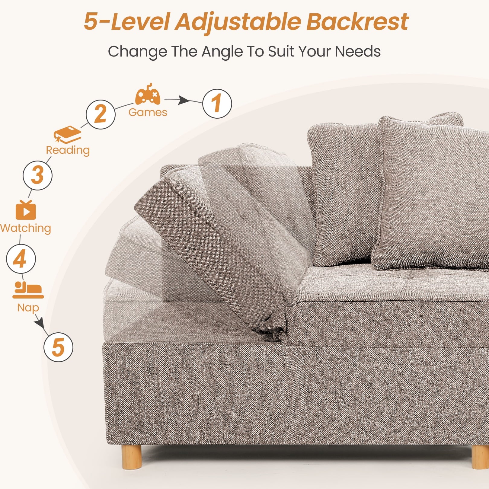 - Comfortable and functional: The sectional sofa bed comes with a five-step adjustable backrest and removable side arms that make it easy to customize the comfort level of the sofa bed. The sofa bed also comes with pillows, both of which provide comfortable support, providing lumbar support for sitting and neck support for sleeping. This practical sofa bed also features side storage pockets to keep your remote control, game controller, thermos, magazines, and pens within easy reach.