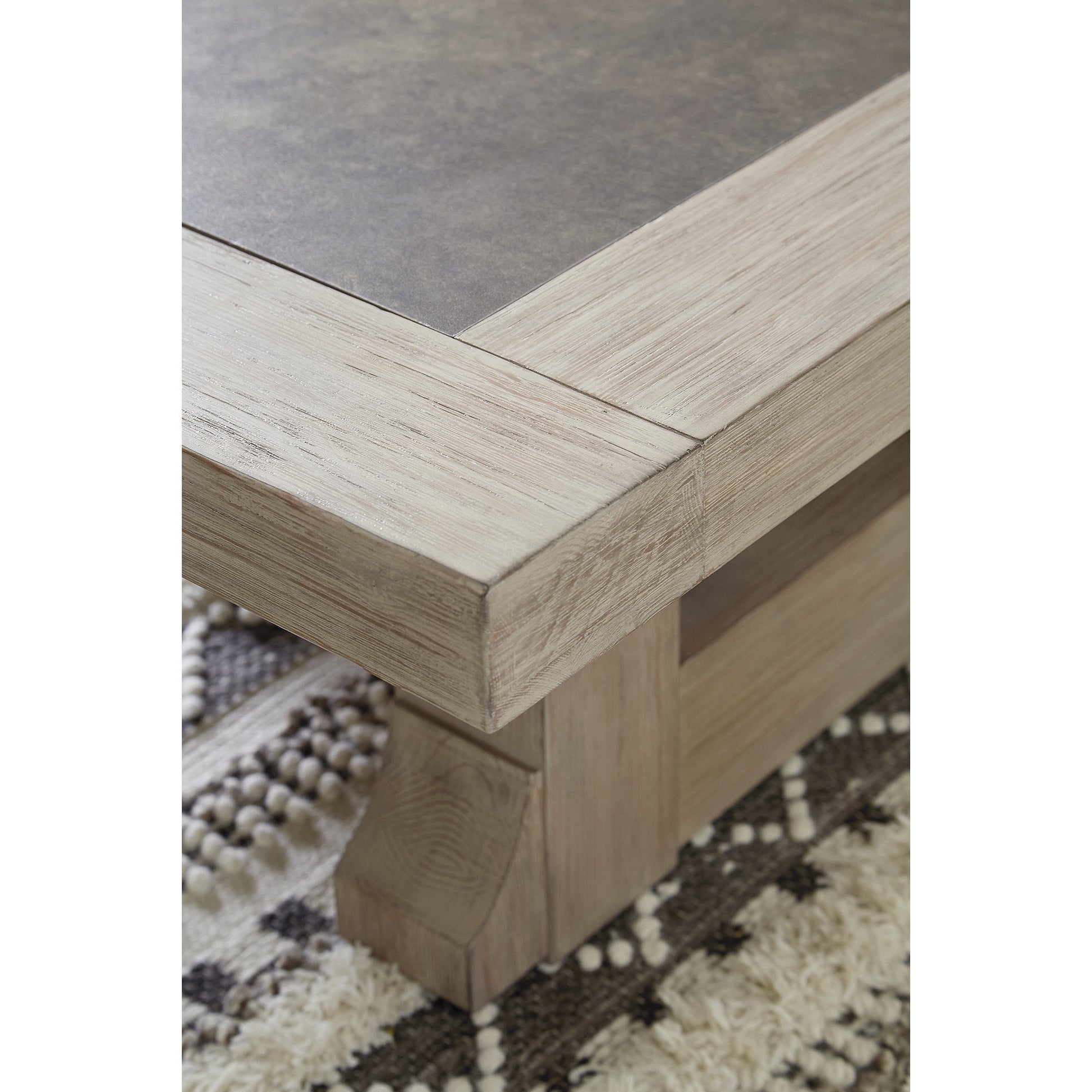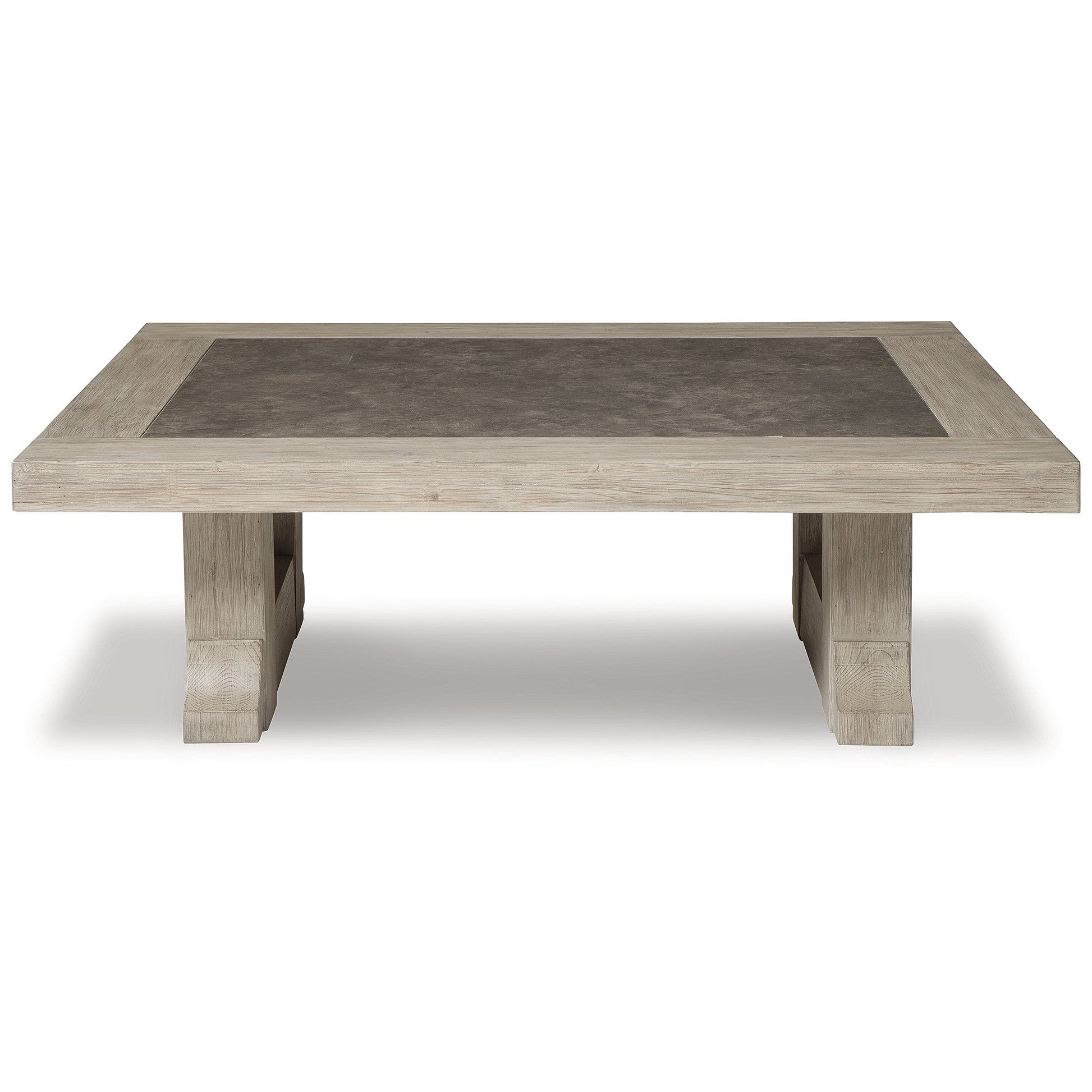 A striking example of rustic refinement, the Hennington coffee table is generously scaled to accommodate your entertainment needs with ease. Made with pine wood and veneer beautified with a complex bisque finish, this designer coffee table includes a top with melamine inset for mixed-media interest.