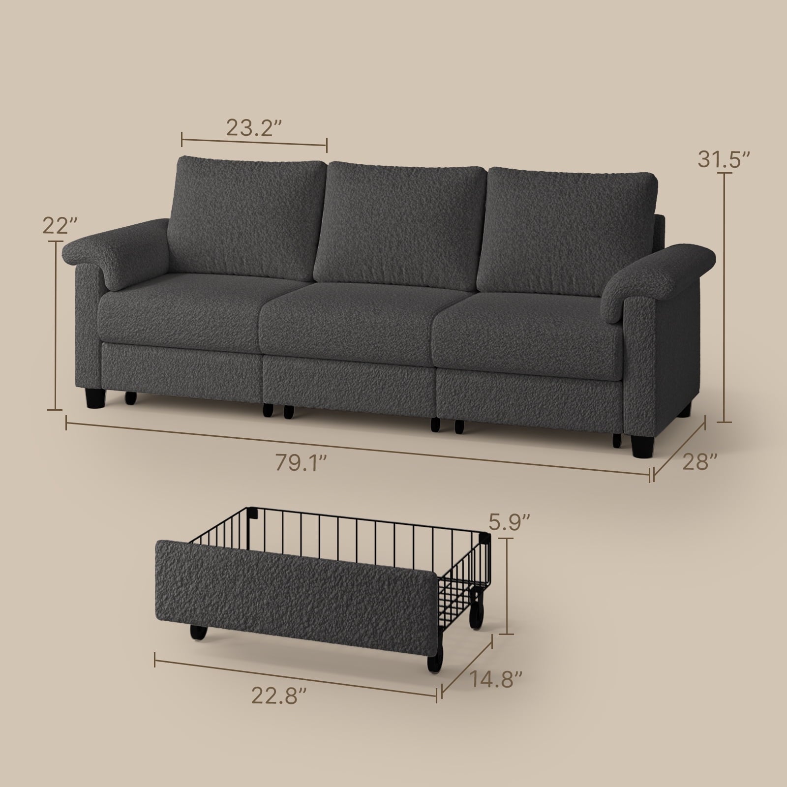 ? Dimensions: 79.1" W x 28" D x 31.5" H ? Dimensions(Drawer): 22.8" W x 14.8" D x 5.9" H ? Fabric: Soft gray velvety texture ? Frame: Sturdy and supportive steel frame ? Storage: Three storage drawers with soft-close mechanisms ? Color: Gray ? Weight: Approximately 120 lbs