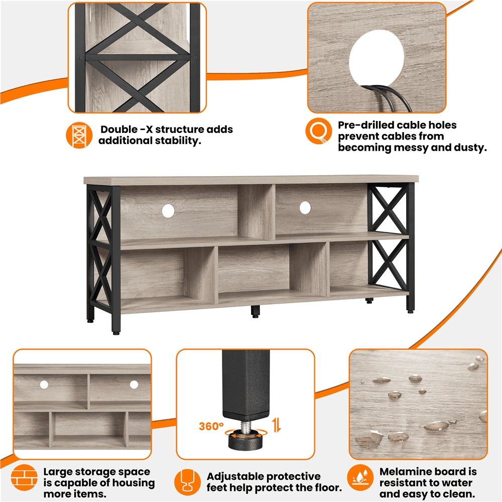 We are constantly vigilant for the latest furniture trends. Our industrial series reflects our approach to the surge in demand over the past few years for this industrial style. We see such a style not just as a trend that prevails but as the reveal of people's yearning for emotional care and nourishment just as what these rustic, unadorned pieces that convey. We hope that our products are not just some pieces of cold furnishings but of warmth that can complement the style of your home and help create your home into a restful habitat to nest. This industrial TV console comes in 2 colors, rustic wood in higher saturation and grey in lighter tone. Both are made of high quality and durable particle board that's been laminated. The sturdy iron frame is black matte coated and in the shape of a double X, not only reinforcing each side, but also counteracting the heaviness by adding airy expression. Our 55" industrial TV stand has 5 open compartments that come in 3 sizes. The 2 seamless large ones have pre-drilled cable management holes that can accommodate game consoles and the other 3 can house trinkets, souveneirs and more.