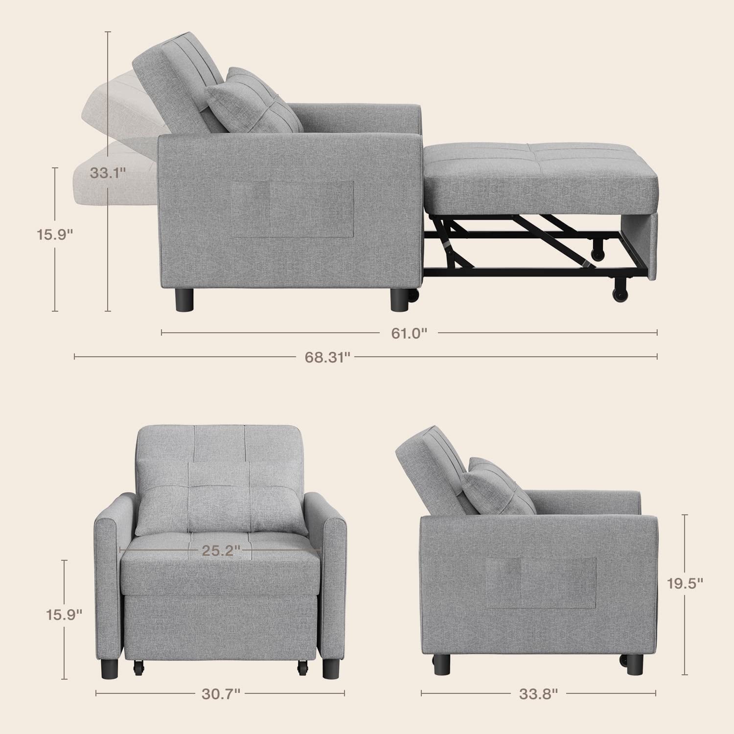 - ???Sleeper Chair is made of high-quality steel frame, ensuring best durability in daily use and withstand 400 lbs, avoiding all risk of injury. Breathable linen fabric and high density sponge ensure support and comfortable. The serpentine springs in the seat cushion inside,which makes the sofa will not deform when sitting for a long time.