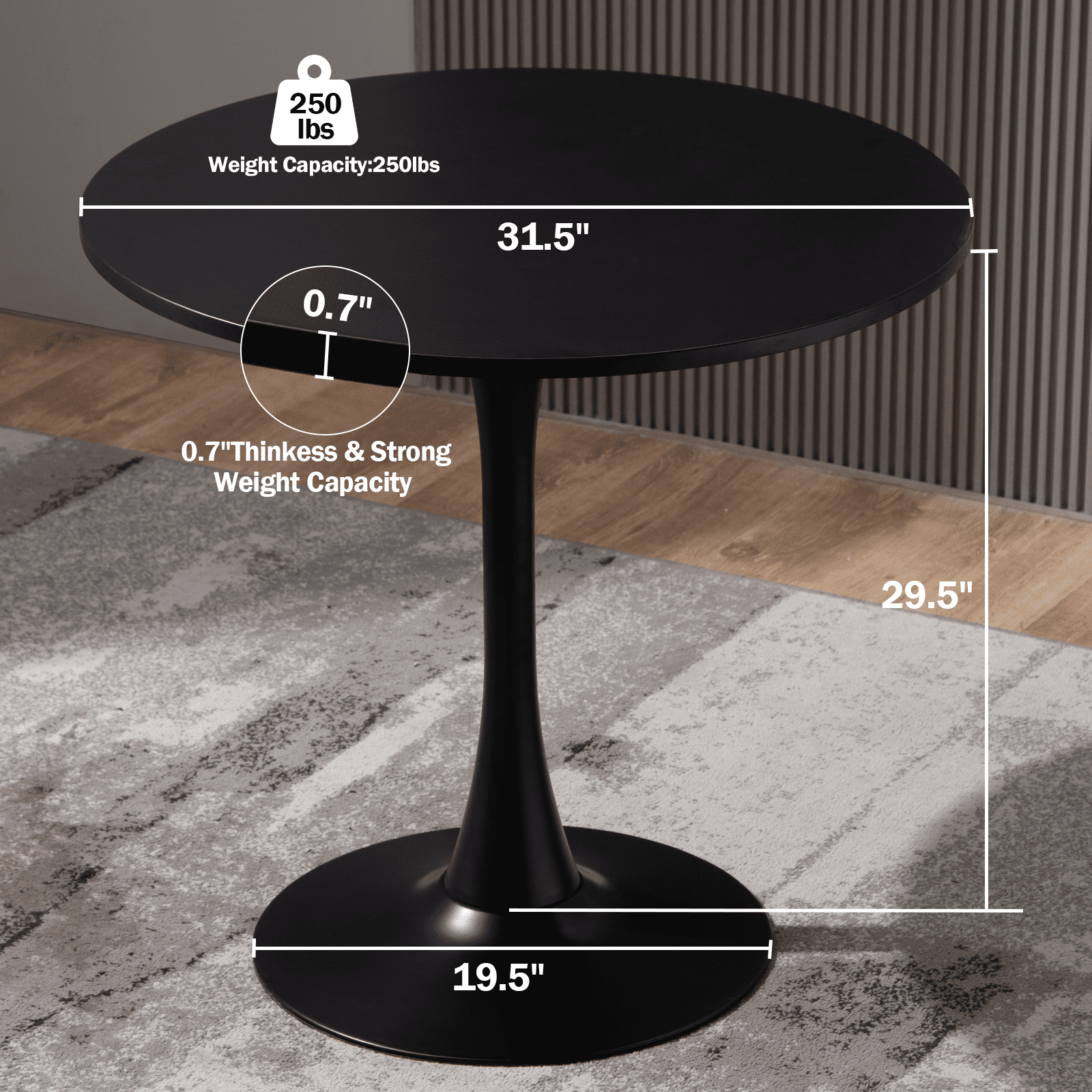 - Round Black Dining Table - This 32 inches modern pedestal dining table has a style of modern mid-century, combined with sturdy metal pedestal base and MDF table top what shipped by 2 packages. The pedestal support base, not only beautiful but much more stable, were especially treated to be anti-rust and heavy-duty (support up to 200 lbs.).Enough space for 2-4 people use.