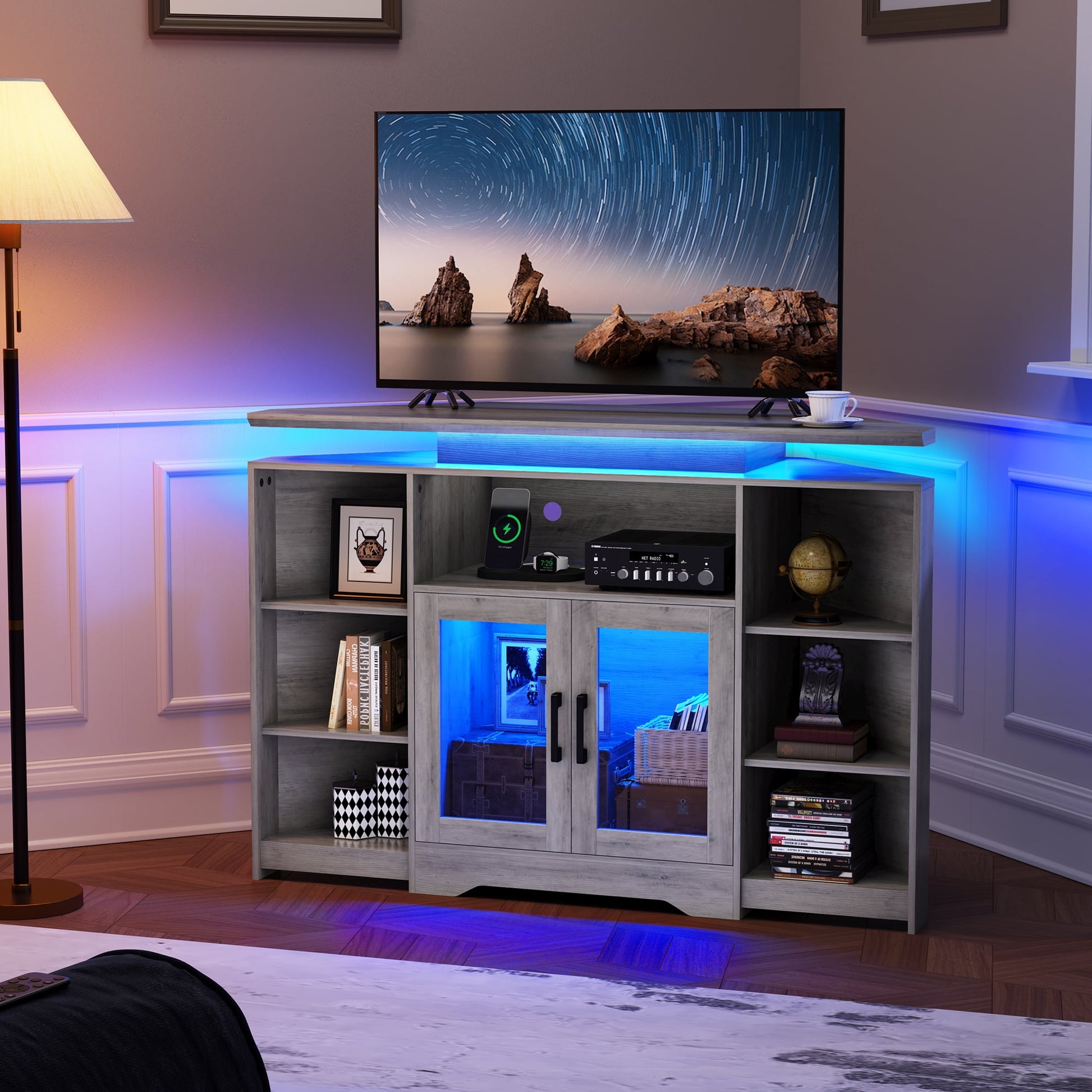 Tall Floating TV Stand, 55in Entertainment Center with LED Lights & Charging Station, Corner Media TV Table with Open Storage & Cabinet, Gray
